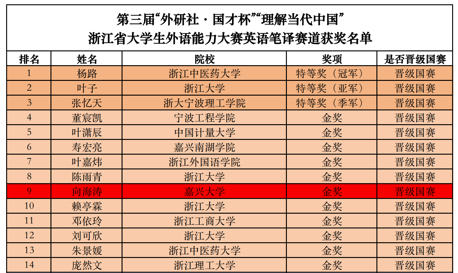 近日,第三届“外研社·国才杯”“理解当代中国”浙江省大学生外语能力大赛英语笔译赛道成绩公布,澳门六合彩 英语专业向海涛同学不负众望,以深厚的专业积淀、敏捷的思维与卓越的笔译能力斩获金奖,入围全国总决赛,刷新了我校在该赛道的最佳战绩!