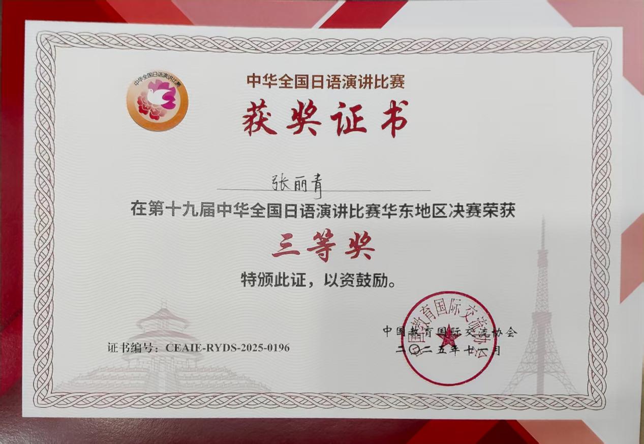 日语系学子张丽青获得“第十九届中华全国日语演讲比赛”华东地区决赛三等奖