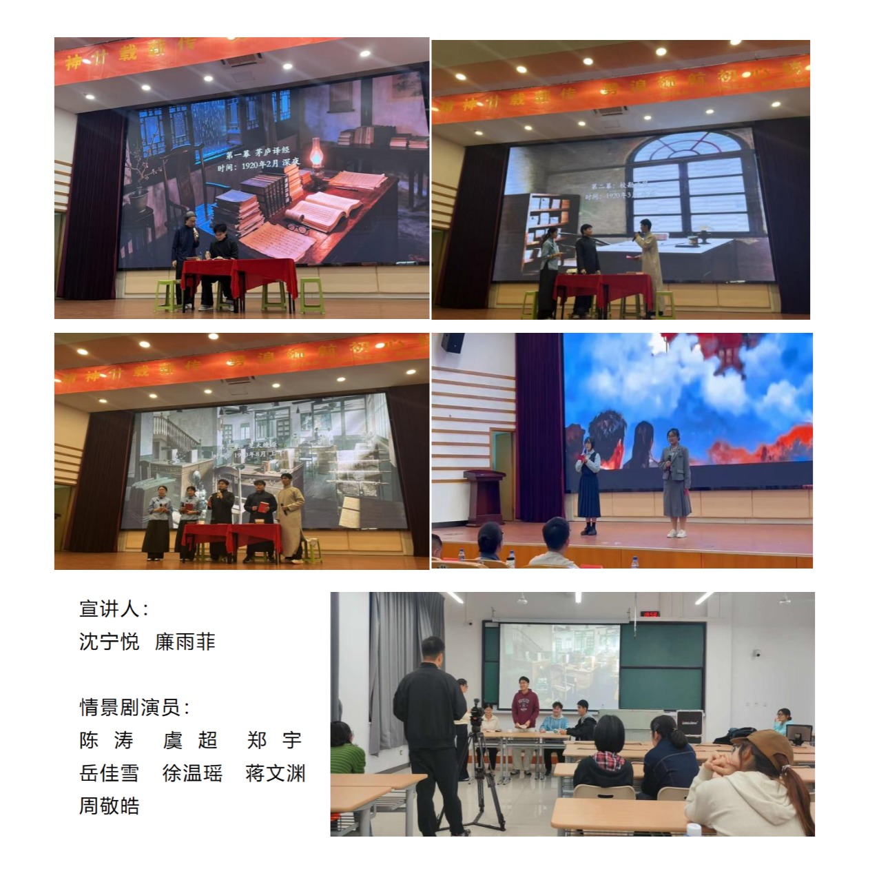 学院围绕“红船薪火廿载燃,外院逐梦语通寰”主题,创新融合VCR展示、情景剧表演与党员宣讲形式,将红色基因与专业特色深度融合。情景剧《真理的味道有点甜》通过“茅庐译经”“校勘攻坚”“星火燎原”三个幕段,生动再现陈望道先生翻译《共产党宣言》的历史场景,传递初心力量。随后,学生党员宣讲人英语231班沈宁悦、英语233班廉雨菲结合专业特色,阐释了语言在传播红色文化、讲述中国故事中的重要作用。