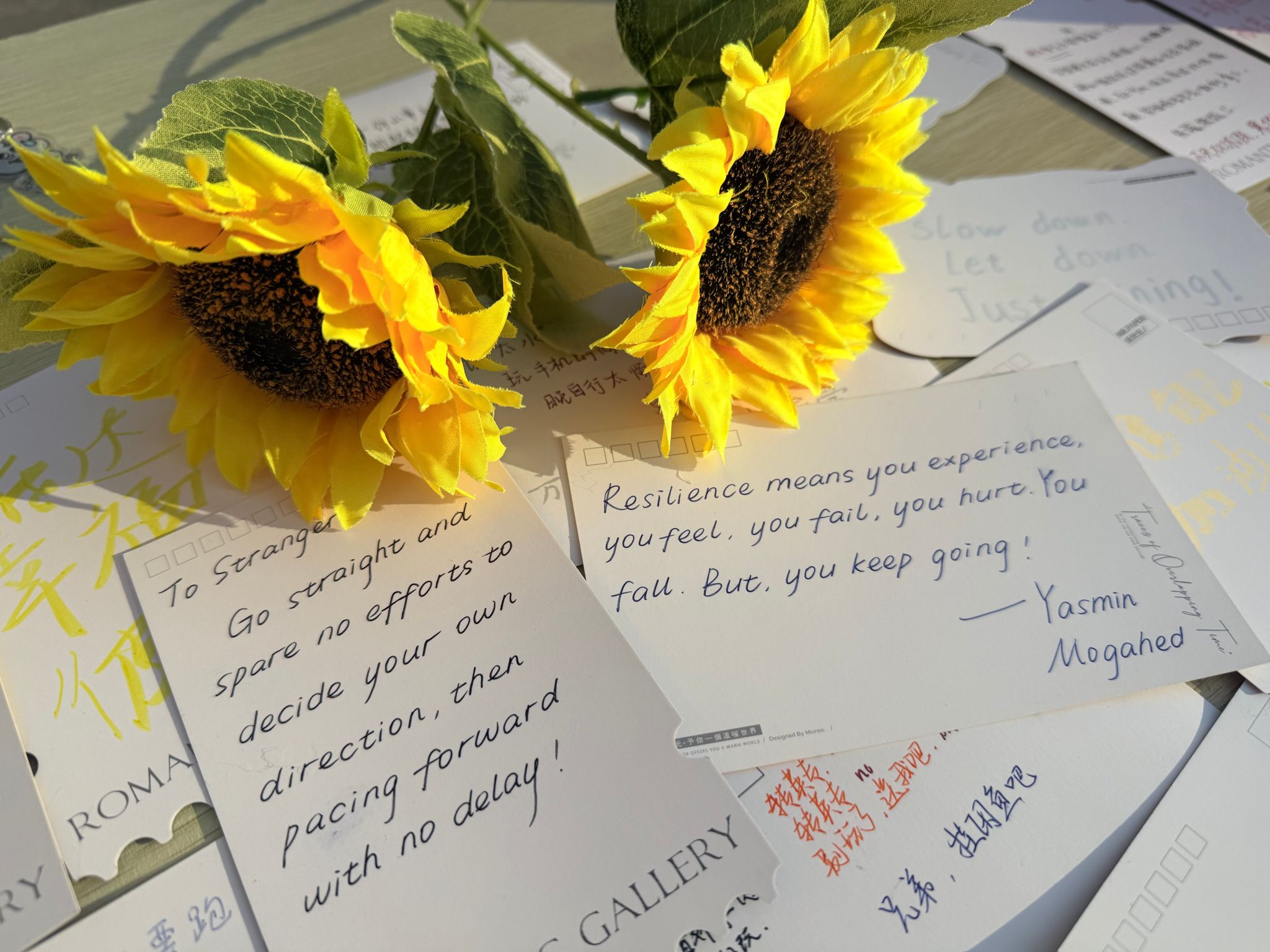 活动现场布置简洁温馨,长桌上摆放着向日葵与多种彩色卡纸。参与者可自取明信片,写下自己的心情或祝福语投入信箱,并随机抽取他人留言。在短短半小时内,信箱中已积累数十张真挚留言,“今天风很温柔”“别怕,明天会亮”等句子成为现场高频互动内容。澳门六合彩 学生会志愿者还在现场提供热茶与主题书签,进一步营造出温暖而宁静的交流氛围。