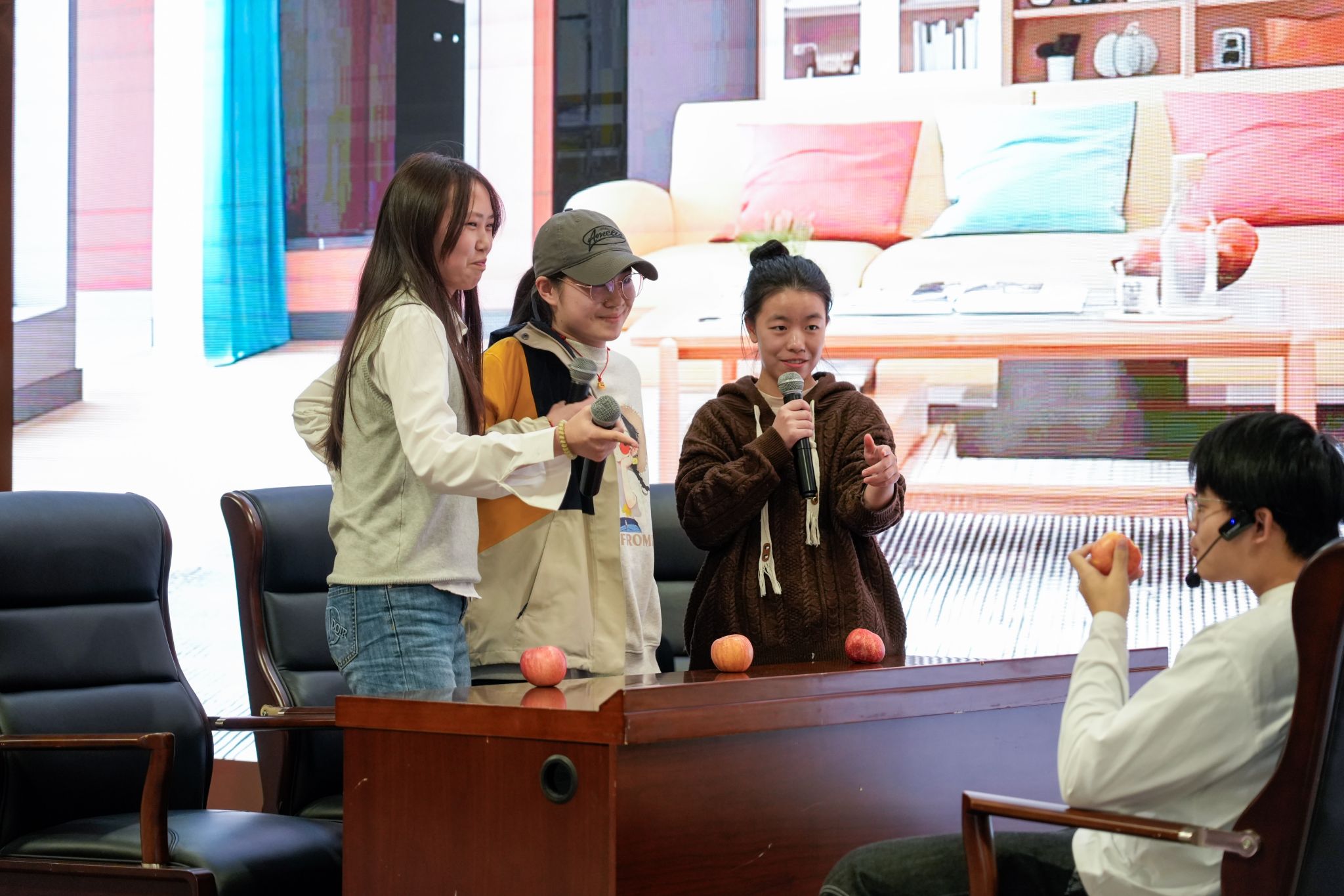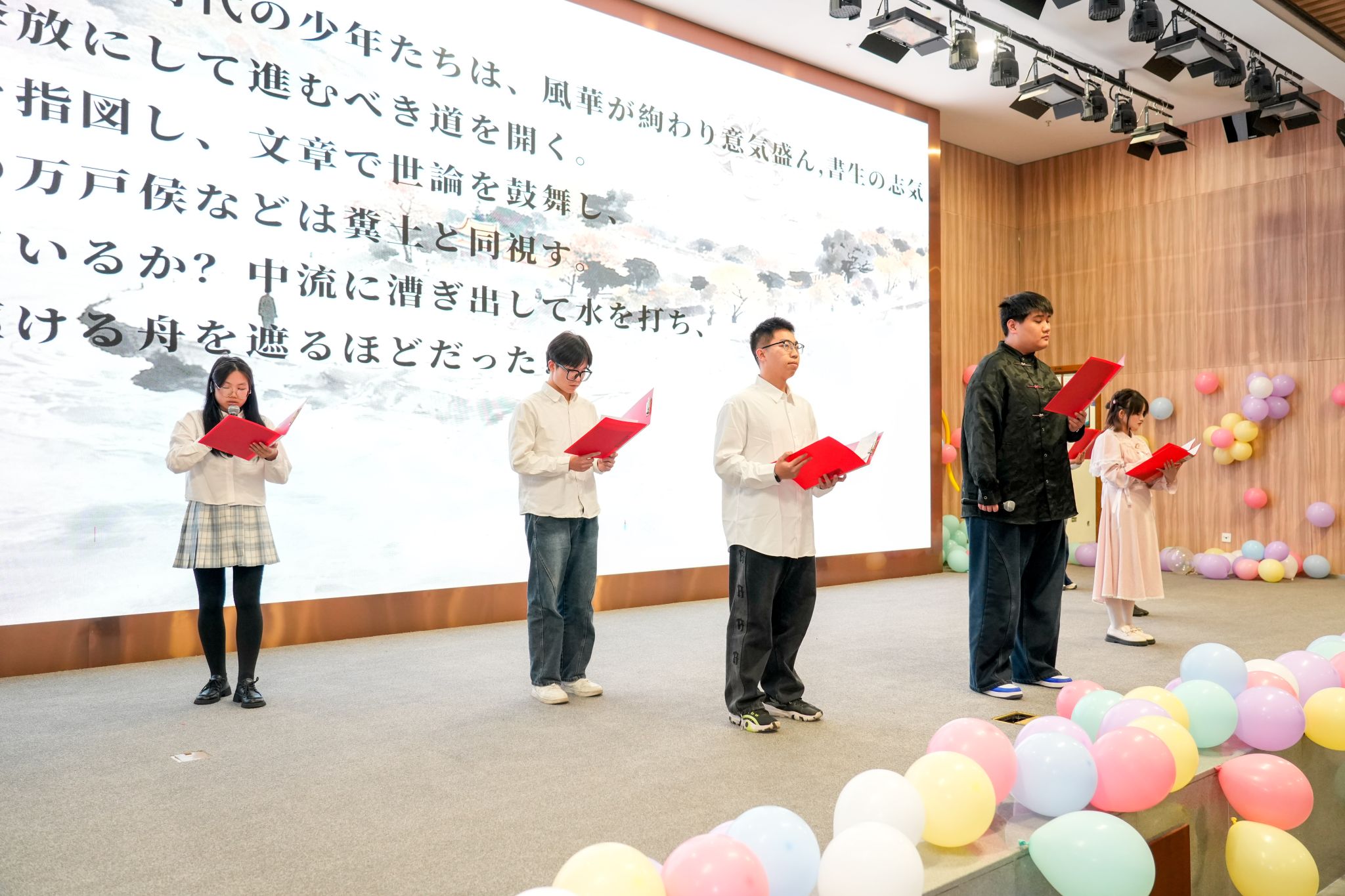 诗意环节《万语诗心》通过深情的多语种诗歌朗诵,引领观众领略语言之美;小提琴独奏《Por una Cabeza》旋律悠扬,彰显艺术修养。其间亦不乏青春洋溢的歌曲演绎,《Wonderful U》、《爱错》等曲目引发全场共鸣,而辅导员陈泳杰老师自弹自唱的《Fly Me to the Moon》更是将浪漫氛围推向高潮。特别环节中,学生党员代表通过情景表演《真理的味道有点甜》,生动诠释了信仰的力量;创意演剧版《爱情公寓》则以英语全新演绎,为熟悉的故事注入别样韵味。活动在歌曲串烧《Planet》《红尘客栈》《I Love You So》的温暖旋律中精彩收官。