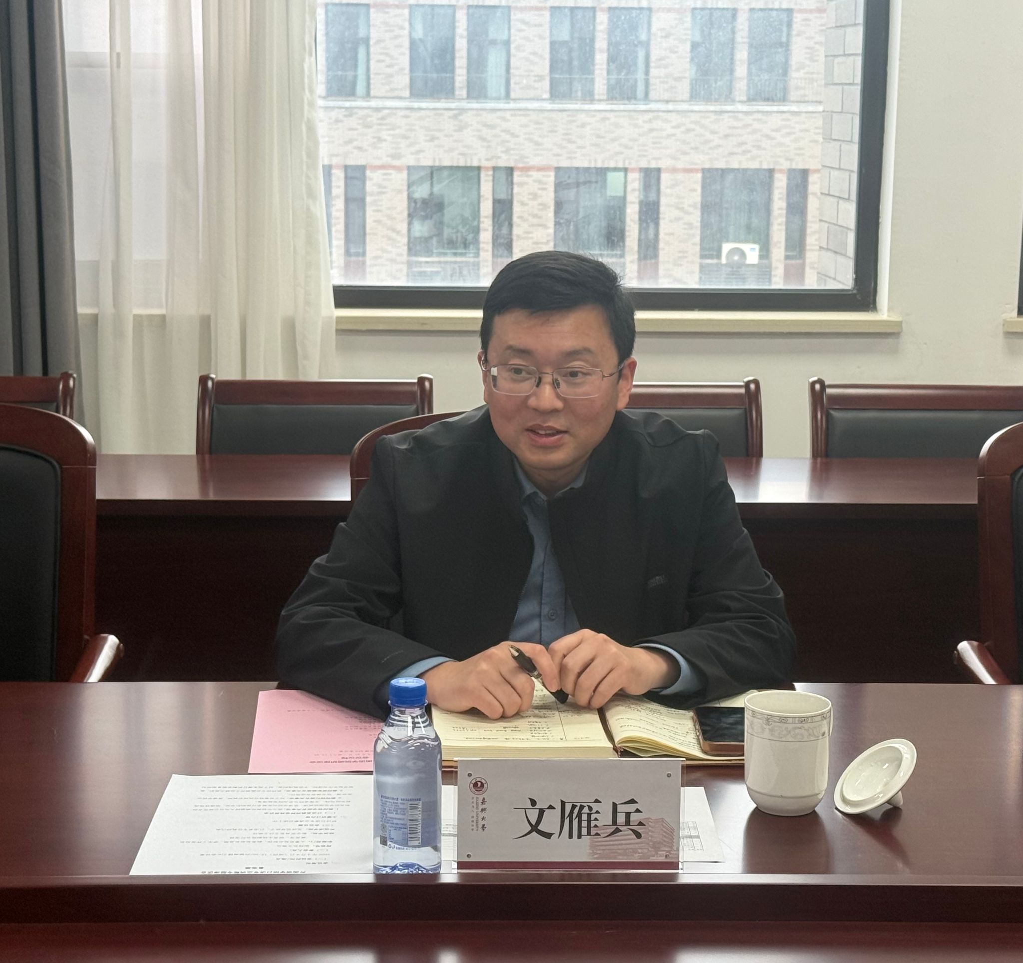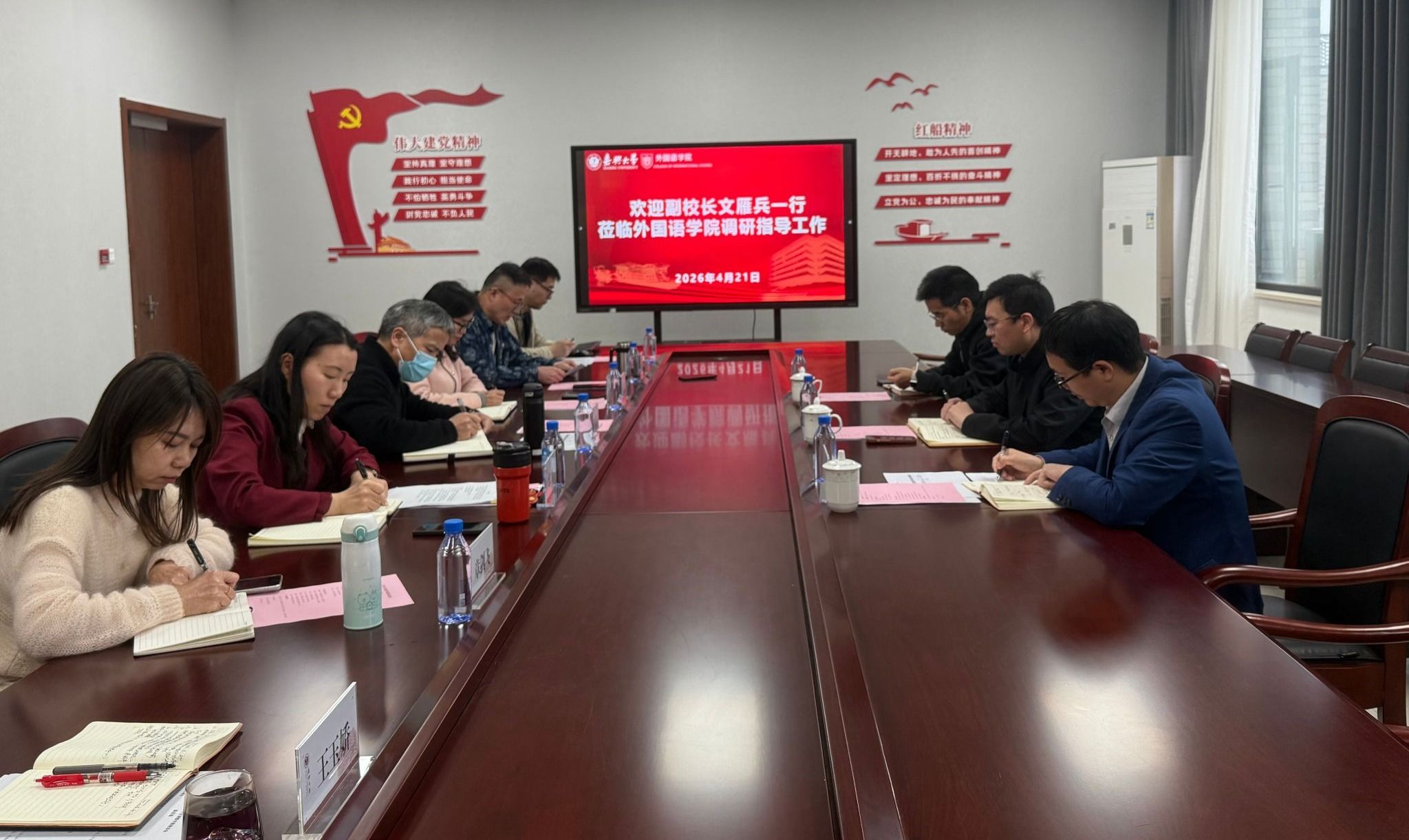 文雁兵充分肯定学院在学科发展、人才培养、学位点建设等方面取得的成效,并就推动学院高质量发展提出三点要求:一是坚持前瞻谋划,通过“区域国别学”交叉学科建设优化学科布局。主动对接国家战略,以区域国别研究为牵引整合资源、凝练特色,全力推进“国际事务”专业学位硕士点申报,打造特色鲜明、优势突出的交叉学科增长点,提升学科核心竞争力。二是紧扣时代发展机遇,推进学科——专业——人才培养一体化建设。紧跟地方经济社会发展需求,优化人才培养方案,强化实践教学与产教融合,推动学科建设、专业发展与人才培养同频共振、同向发力,着力培养适应区域发展的复合型、应用型外语人才,不断提升人才培养水平与社会贡献度。三是深化学科交叉融合,构建协同创新机制。充分挖掘地方文化资源,推动外语学科与国际事务、区域经济等领域交叉融合,整合校内外优质资源,培育创新团队与高水平科研成果,以学科交叉赋能学院高质量发展。
