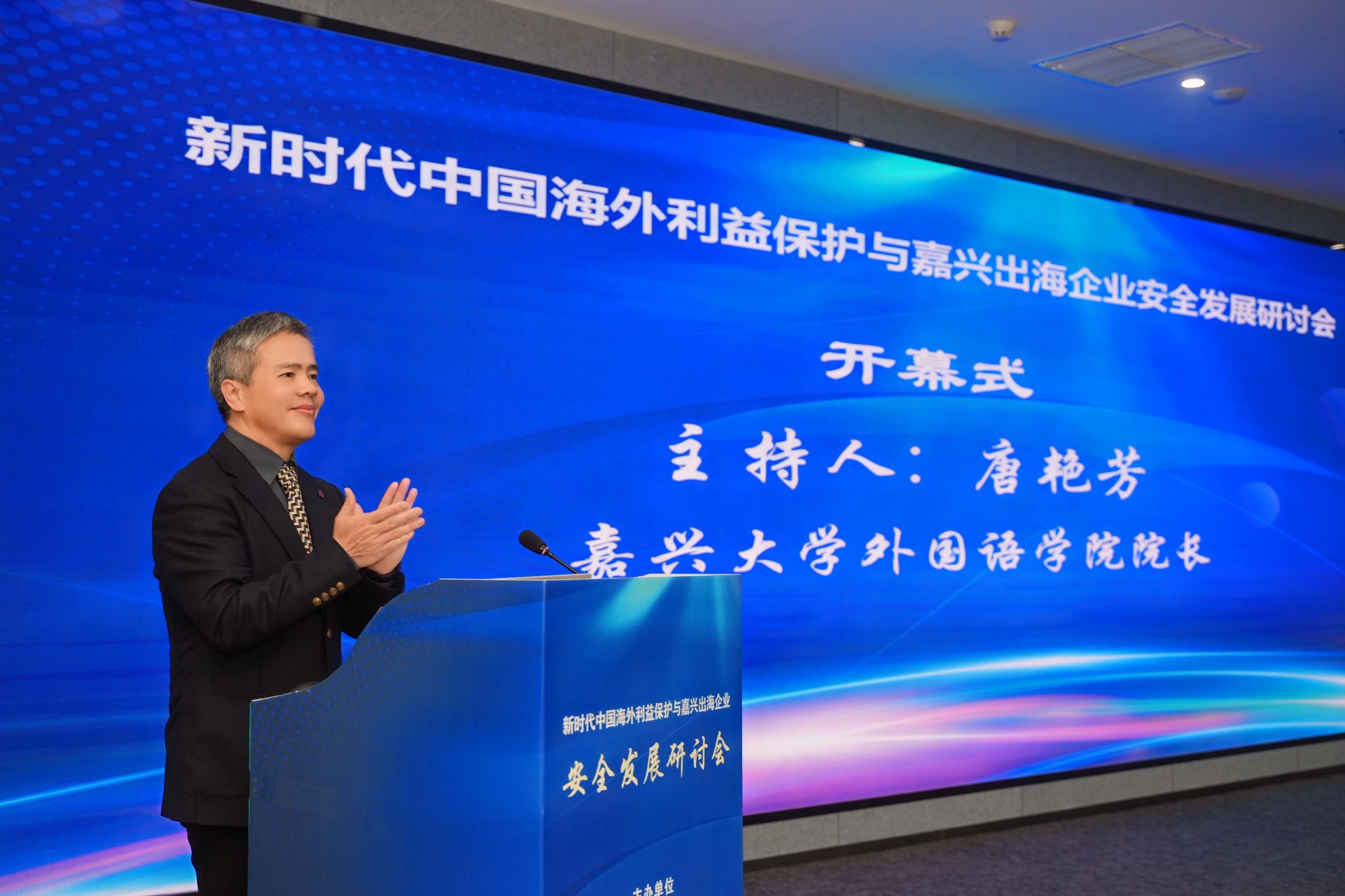 於建明在致辞中指出,海外利益保护事关发展安全,企业安全发展事关嘉兴未来。当前国际局势复杂多变,企业“出海”安全挑战日益增多,海外利益保护已成为必须答好的“必修课”。他希望与会嘉宾以本次研讨会为契机,围绕“海外利益保护”聚智聚力,为嘉兴企业出海行稳致远保驾护航,为国家海外利益保护战略落地落实贡献力量。於建明表示,嘉兴大学将持续大力推动区域国别学交叉学科建设,依托多学科优势建强嘉兴安澜研究中心智库平台,聚焦政策咨询与投资风险预警,打造“智库+教育”双平台,构建“咨政——人才——传播”三位一体战略支撑体系,以学术成果搭建国际对话桥梁、提升中国全球治理话语权,高质量服务区域高水平对外开放,为嘉兴打造长三角全面开放新高地贡献力量。